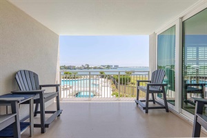 The King master suite features a private bath with a walk-in shower, while the Queen guest room shares a full hall bath. Step out onto the private balcony, accessible from both the living room and master suite, and take in breathtaking bay views—perfect for morning coffee or evening sunsets.