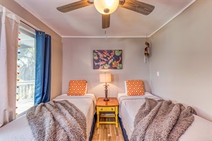 The pool house, located on the ground level, is a private retreat designed for entertaining. It features a full kitchen with dining bar, living area with sleeper sofa and futon, double bed, full bathroom, and second washer/dryer. Double doors open directly to the covered patio and pool, giving everyone easy access to fun in the sun.